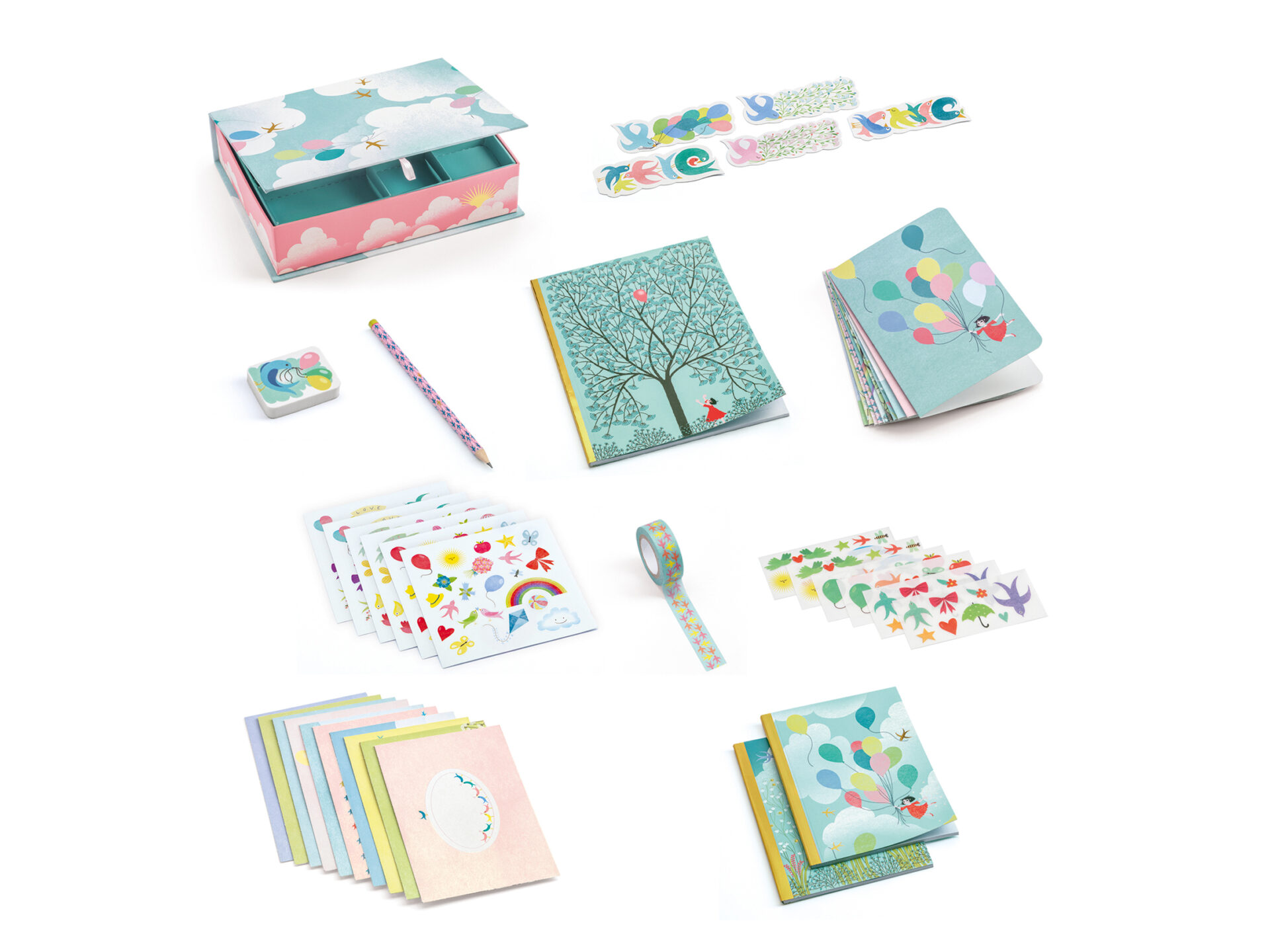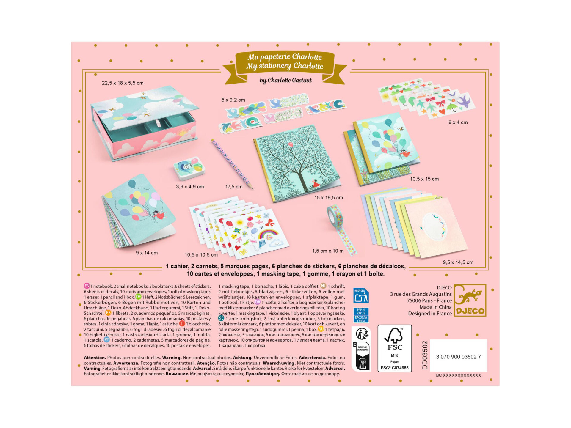 Il set è composto da 1 scatola stampata con scomparto rimovibile (22,5 x 18 x 6 cm), all’interno 10 cartoline illustrate e 10 buste illustrate, 6 fogli di decalcomanie, 5 segnalibri, 6 fogli di adesivi, 1 rotolo di nastro adesivo, 1 matita, 1 gomma, 2 quaderni a righe piccoli e 1 quaderno a righe grande.