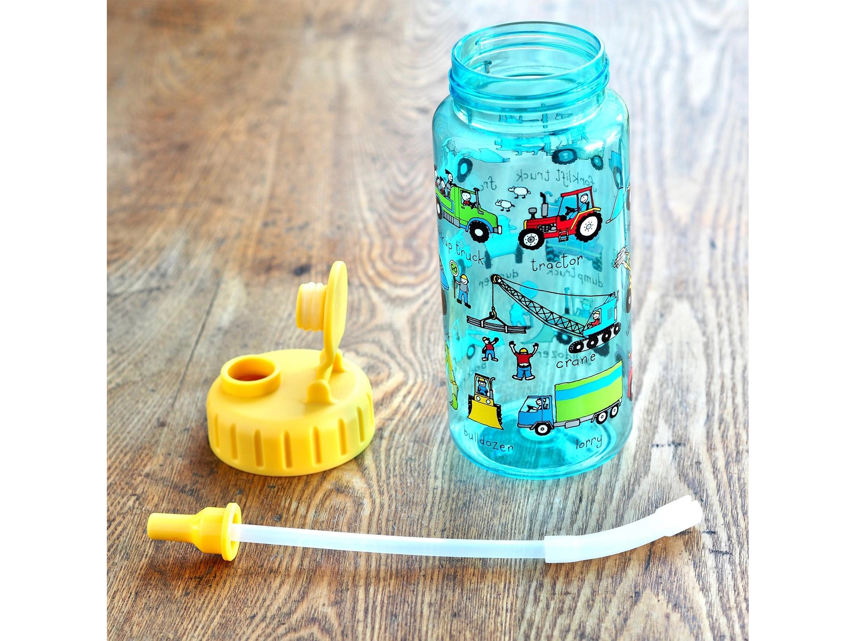 Simpatica borraccia della linea Tyrrell Katz decorata a tema camion e mezzi da lavoro… pratica, sicura e resistente, realizzata in Ecozen, PP (polipropilene), tritan BPA Free.