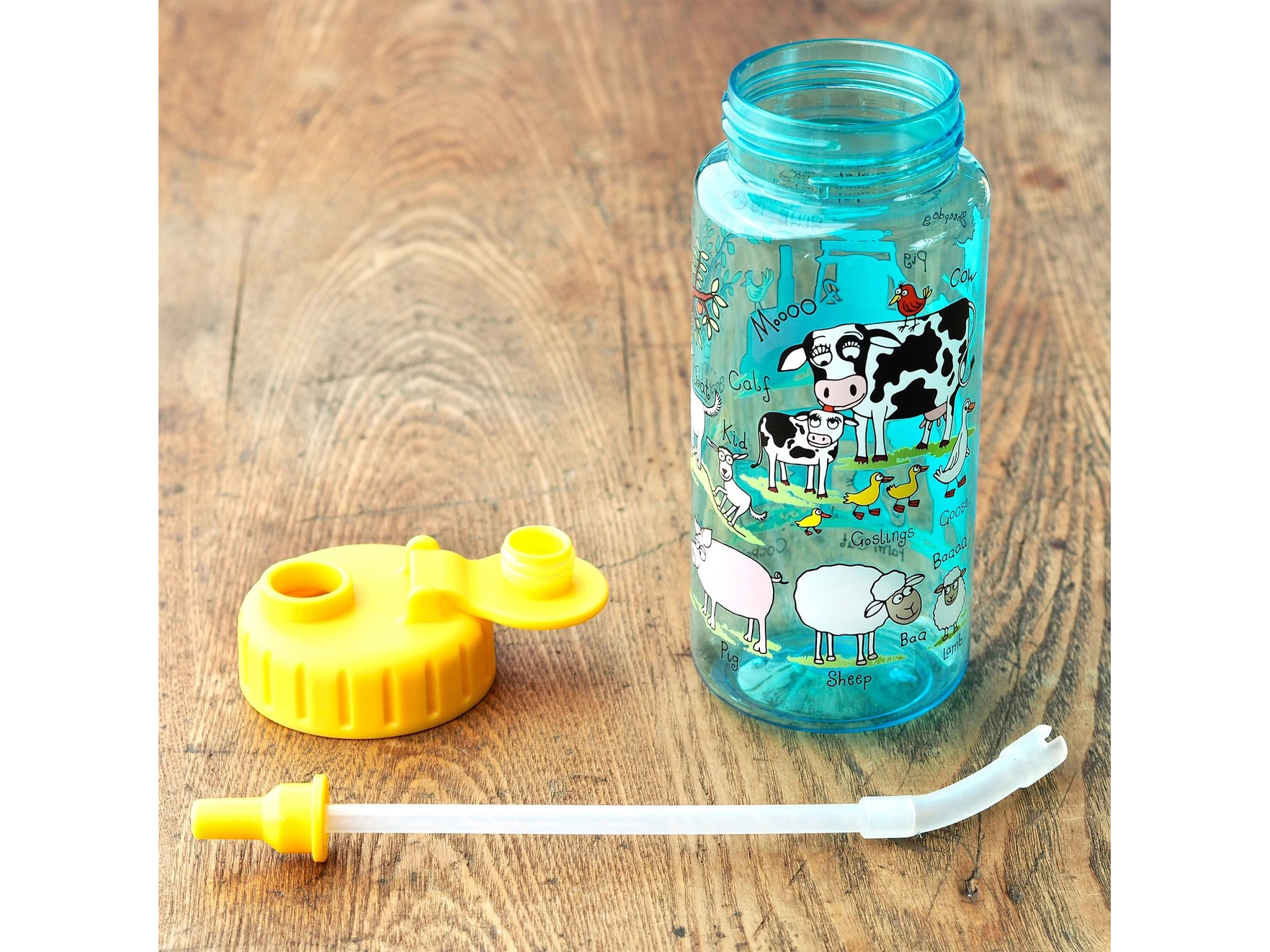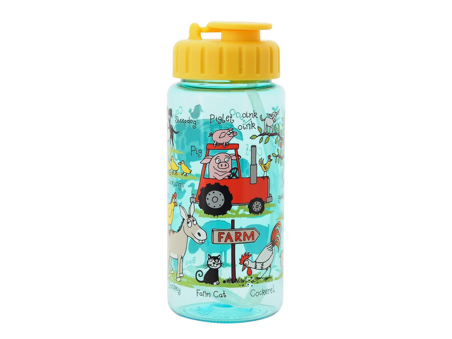Simpatica borraccia della linea Tyrrell Katz decorata a tema fattoria… pratica, sicura e resistente, realizzata in Ecozen, PP (polipropilene), tritan BPA Free.