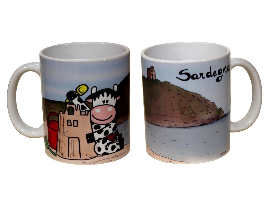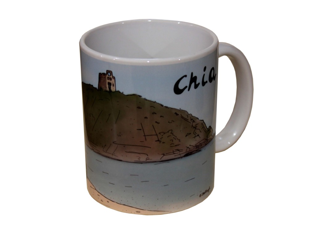 Tazza in ceramica realizzata su disegno originale ”Dettagli”. Sullo sfondo la Torre di Chia a Domus de Maria.