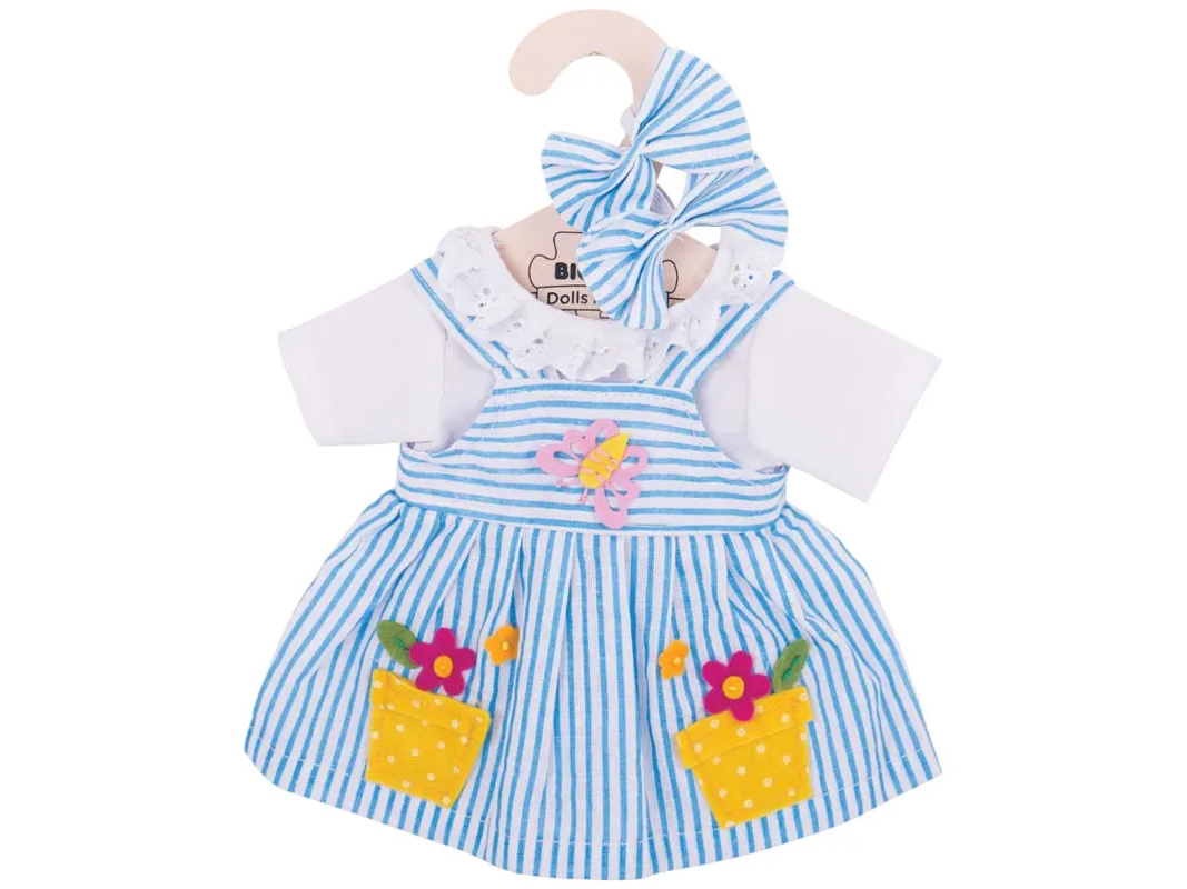 Questo grazioso vestito per bambole di pezza, con stampa a righe blu e dei simpatici vasetti è adatto alle nostre bambole da 35 cm.