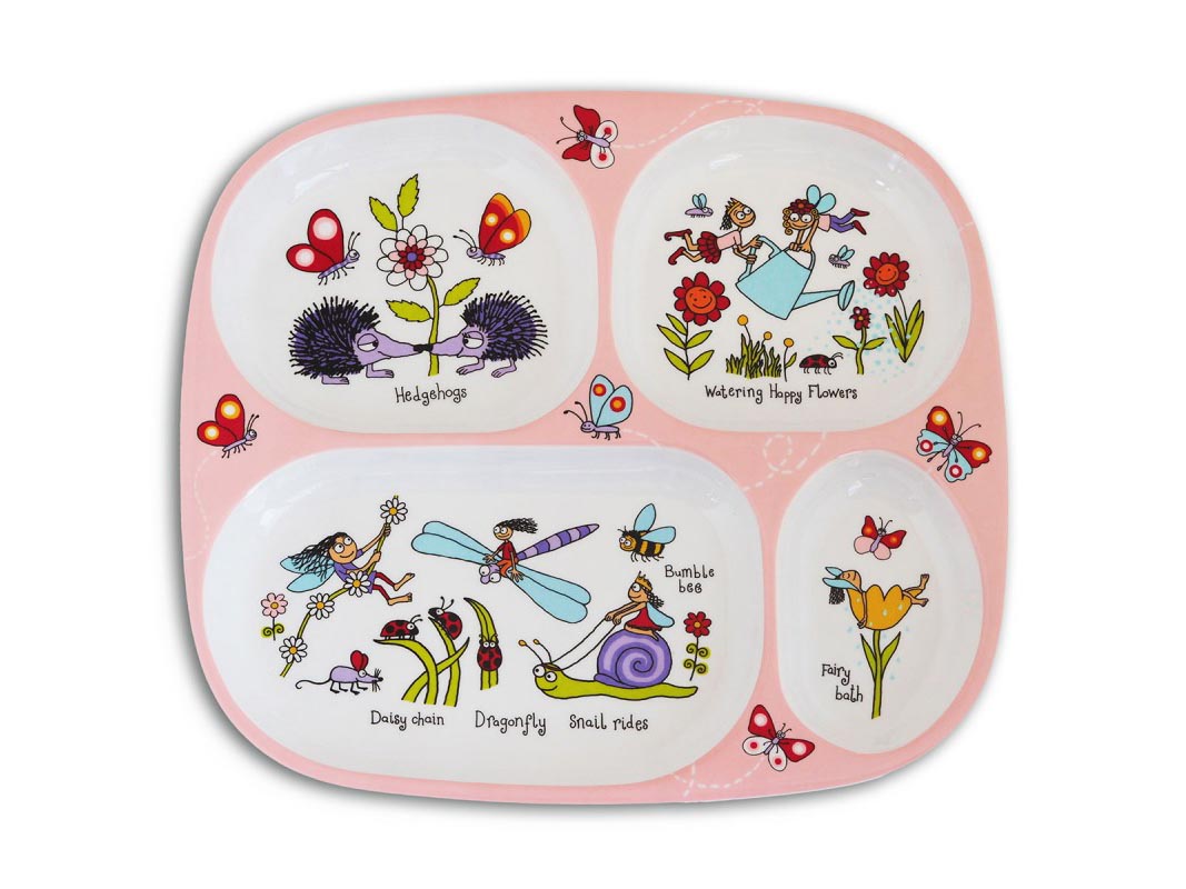 Delizioso piatto con 4 scomparti in melamina BPA FREE decorato a tema giardino..