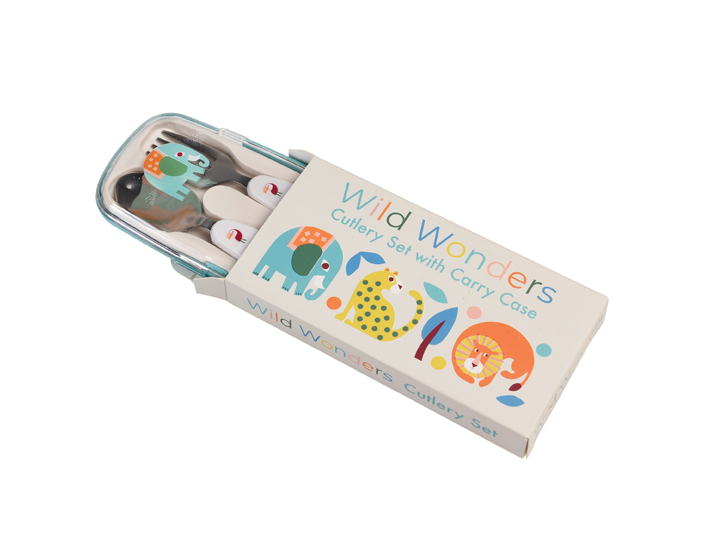 Delizioso set di posate con il manico decorato con tanti animali colorati.