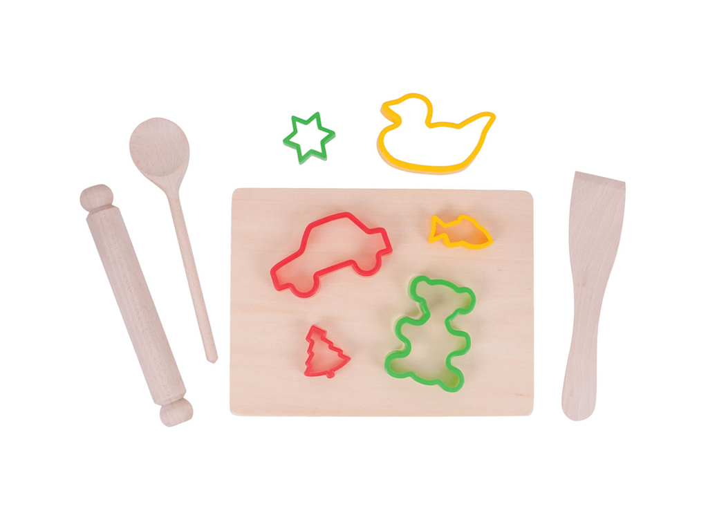 Un bellissimo set completo di cucchiaio di legno, una spatola, una spianatoia e un mattarello e sei forme di tagliapasta dai colori vivaci, tra cui una stella, un’auto, un cane, un albero di Natale, un treno e un pinguino.