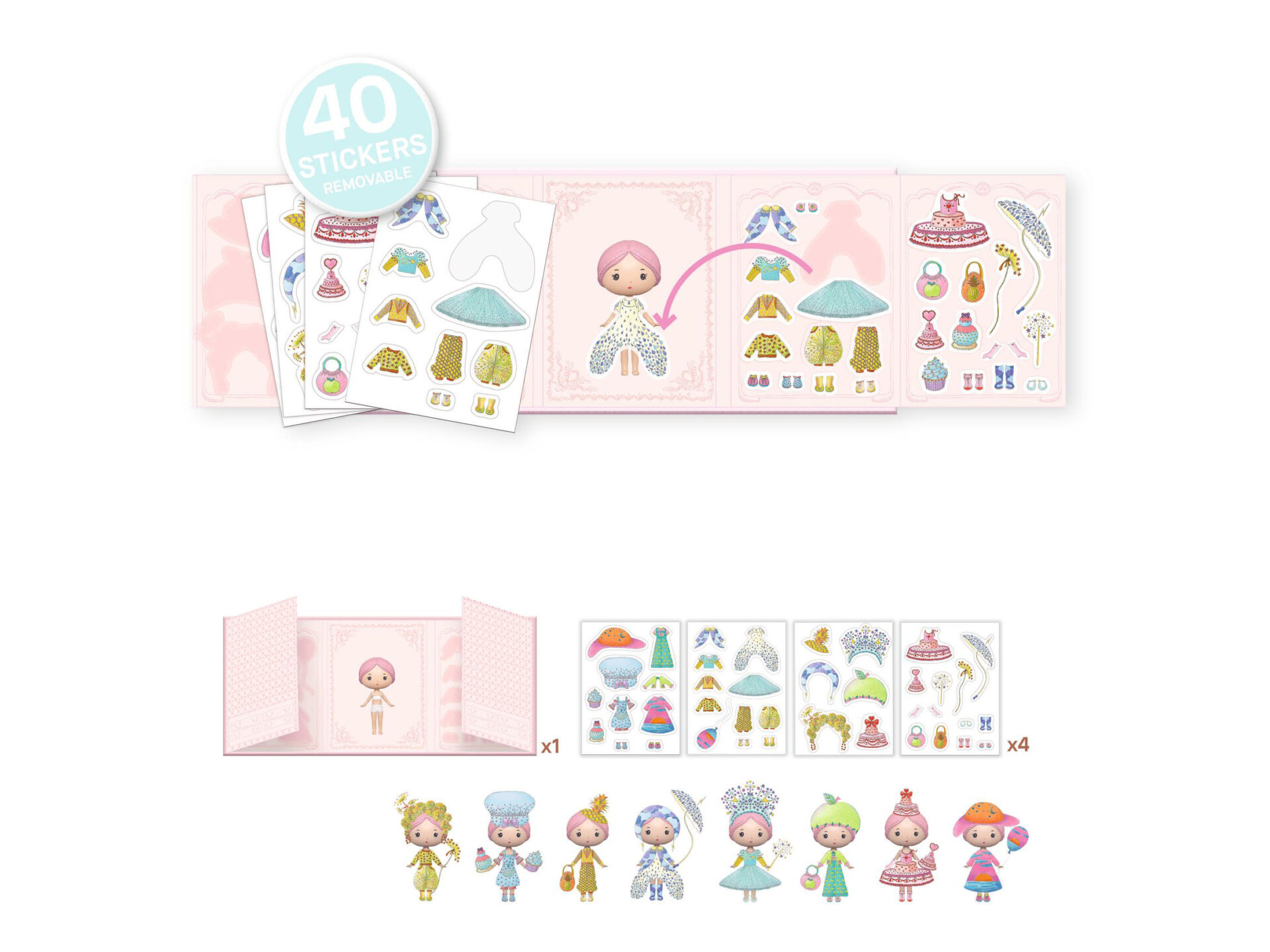 Vesti e crea la tua bambola Tinyly personalizzata disegnando i suoi abiti con 40 adesivi in ​​vinile rimovibili per creare infiniti outfit fantasiosi e poetici!
