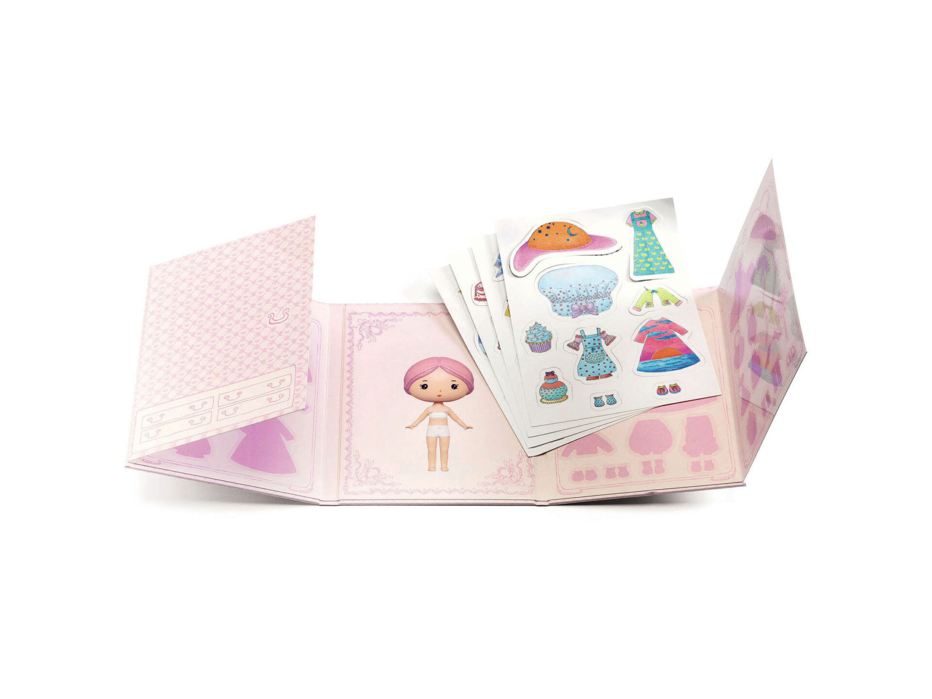 Il libretto si apre per rivelare la bambola da vestire al suo interno. Con 4 pannelli appendiabiti di forme specifiche per riporre vestiti, scarpe e accessori incollandoli.